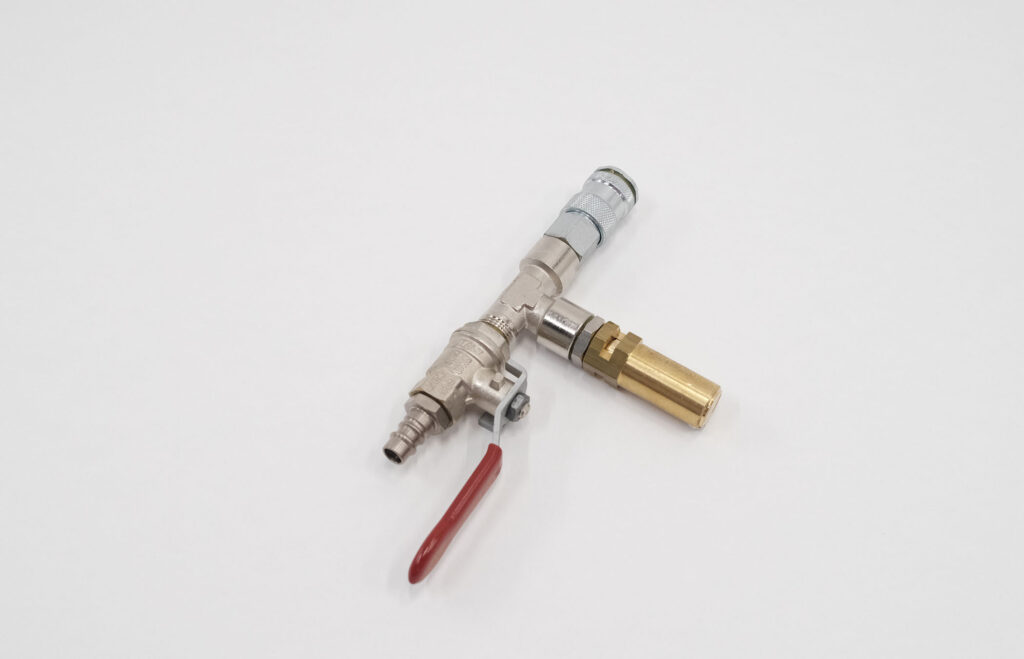De afsluitklep kunt u direct op het hefkussen plaatsen. Nadat het hefkussen is opgeblazen kunt u de klep sluiten en de slang loskoppelen om bijvoorbeeld een ander hefkussen op te blazen. Het eerste hefkussen blijft in opgeblazen toestand staan. Met de afsluitklep kunt u het hefkussen gecontroleerd leeg laten lopen of eerst de bedieningsunit weer aansluiten en het hefkussen met de bedieningsunit gecontroleerd leeg laten lopen en of verder opblazen.
