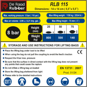 Het RLB 1 hefkussen is een gevulkaniseerd hefkussen. De afmetingen zijn: 140 x 140 x 23mm, het gewicht is 0,4 KG. De maximale hefcapaciteit bij 8 Bar bedraagt 11,5 KN ofwel ca. 1,1 Ton en de maximale hefhoogte is 75mm.