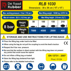 Het RLB 10 hefkussen is een gevulkaniseerd hefkussen. De afmetingen zijn: 380 x 380 x 23mm, het gewicht is 3,8 KG. De maximale hefcapaciteit bij 8 Bar bedraagt 103 KN ofwel ca. 10,5 Ton en de maximale hefhoogte is 210mm.