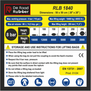Het RLB 18 hefkussen is een gevulkaniseerd hefkussen. De afmetingen zijn: 500 x 500 x 23mm, het gewicht is 6,4 KG. De maximale hefcapaciteit bij 8 Bar bedraagt 184 KN ofwel ca. 18,7 Ton en de maximale hefhoogte is 290mm. Let op de hefcapaciteit neemt af bij een toename van de hefhoogte, zie hiervoor de grafiek in de brochure. De brochure vindt u op https://www.hefkussens.nl/vulcanised/.