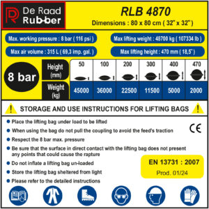 Het RLB 48 hefkussen is een gevulkaniseerd hefkussen. De afmetingen zijn: 800 x 800 x 25mm, het gewicht is 17,8 KG. De maximale hefcapaciteit bij 8 Bar bedraagt 487 KN ofwel ca. 49,6 Ton en de maximale hefhoogte is 470mm.
